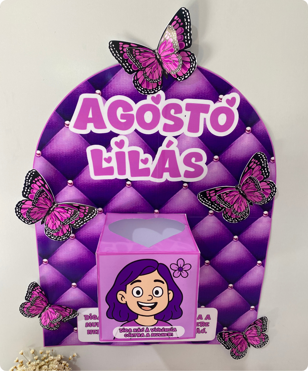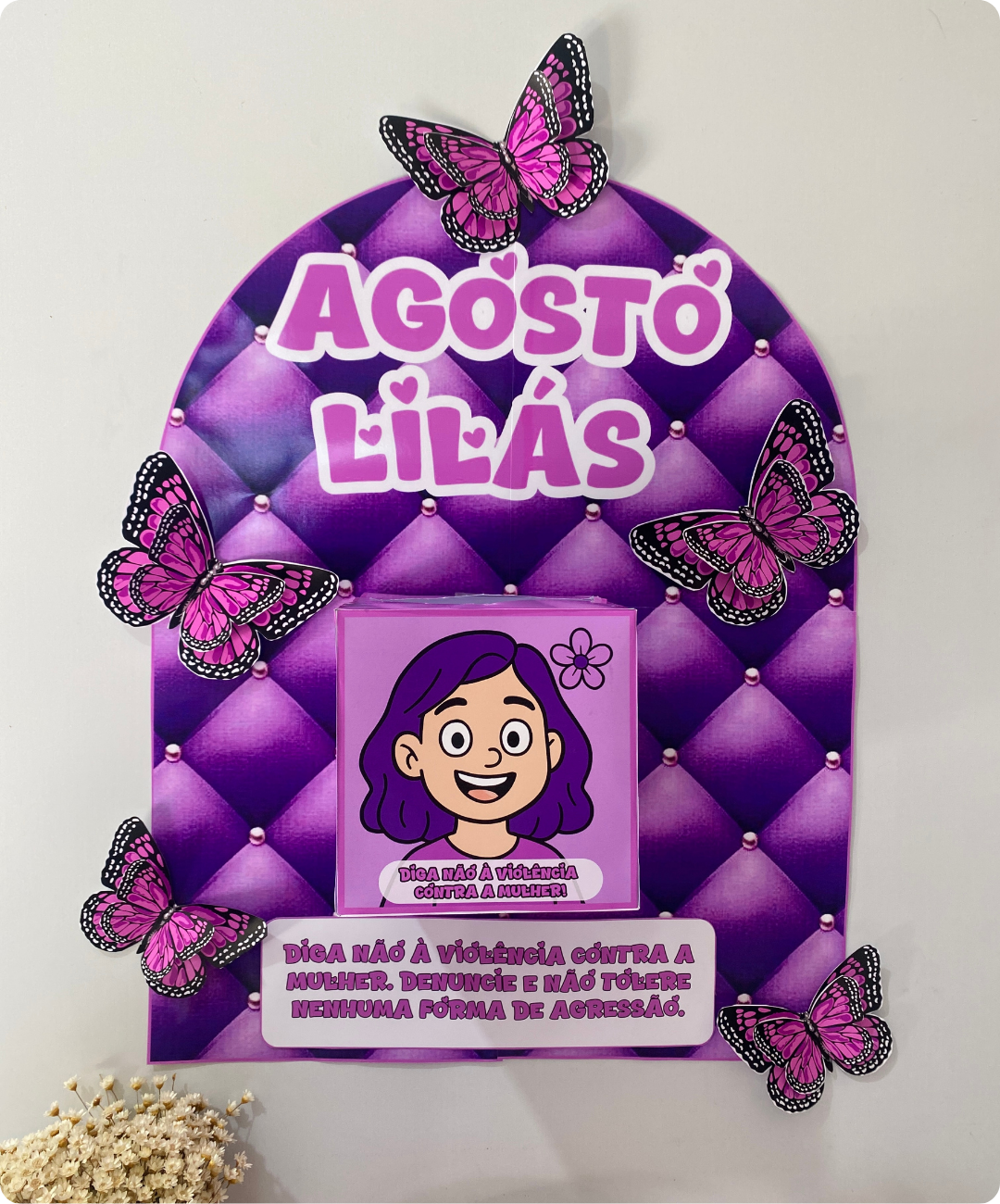 • Painel no tema Agosto Lilás, em cores vibrantes para decorar e conscientizar;