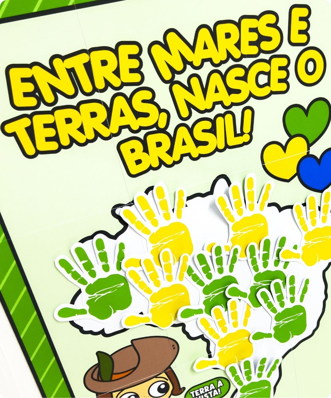 Este material pedagógico em PDF é composto por 9 folhas numeradas para facilitar a montagem coletiva. A proposta une arte e história: as crianças carimbam as mãos com as cores da bandeira, recortam e colam, dando vida ao mapa do Brasil.