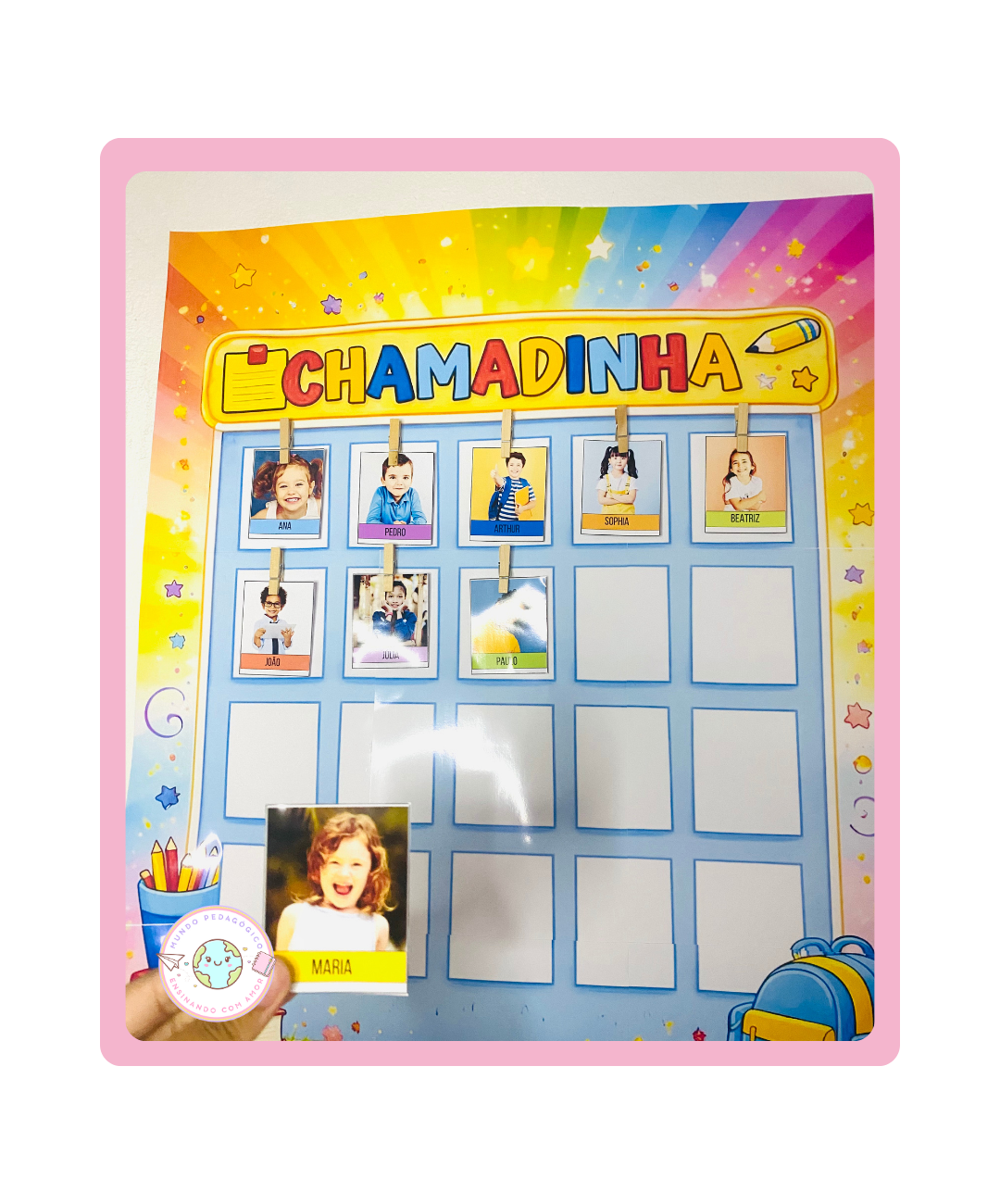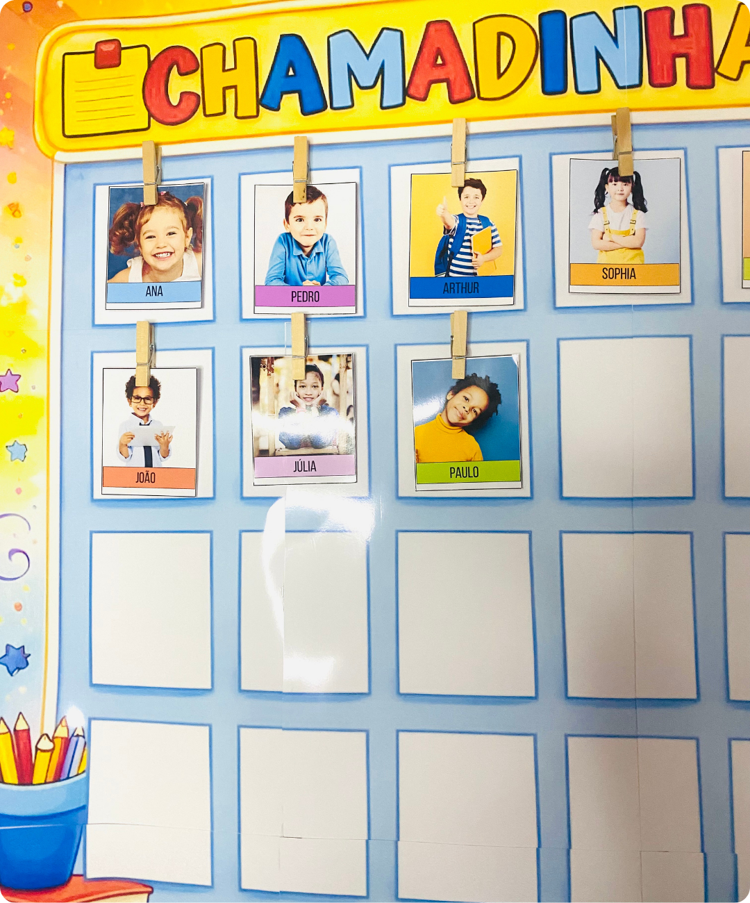 Nossa Chamadinha Interativa é perfeita para engajar os pequenos, tornando cada nome e cada rosto uma descoberta.