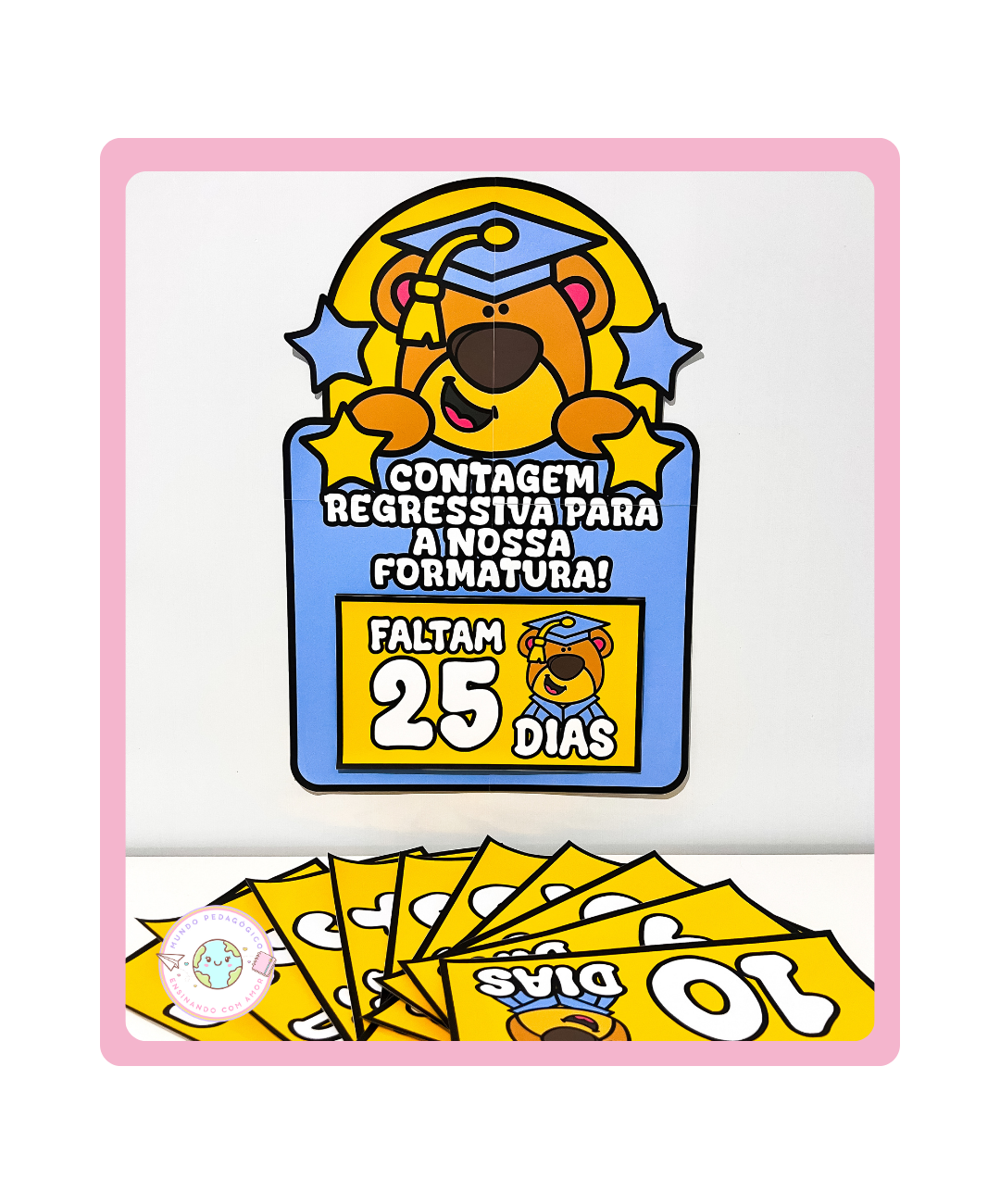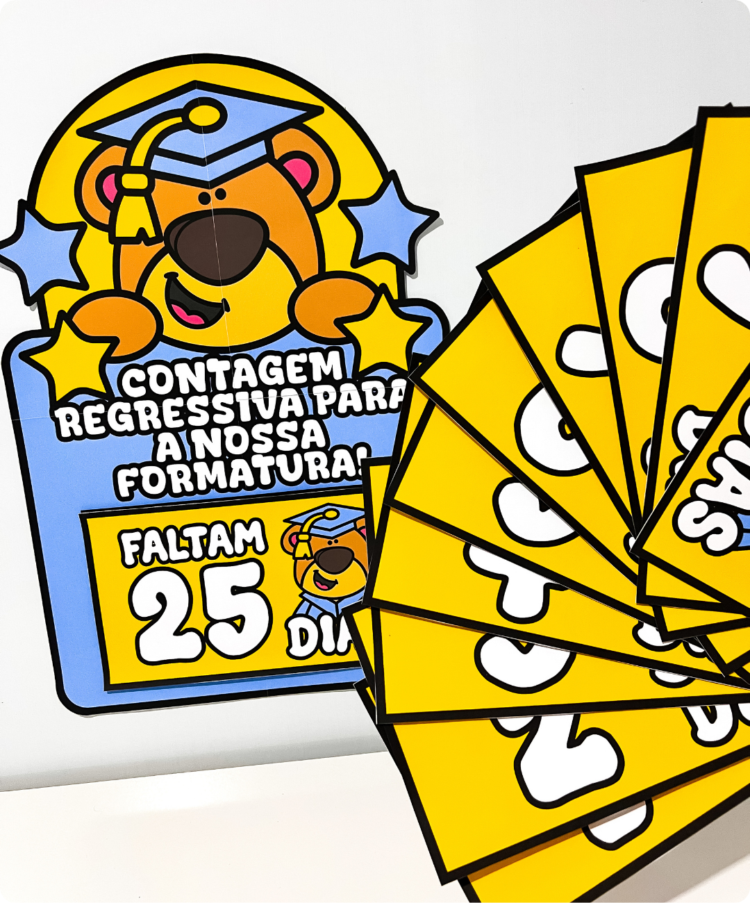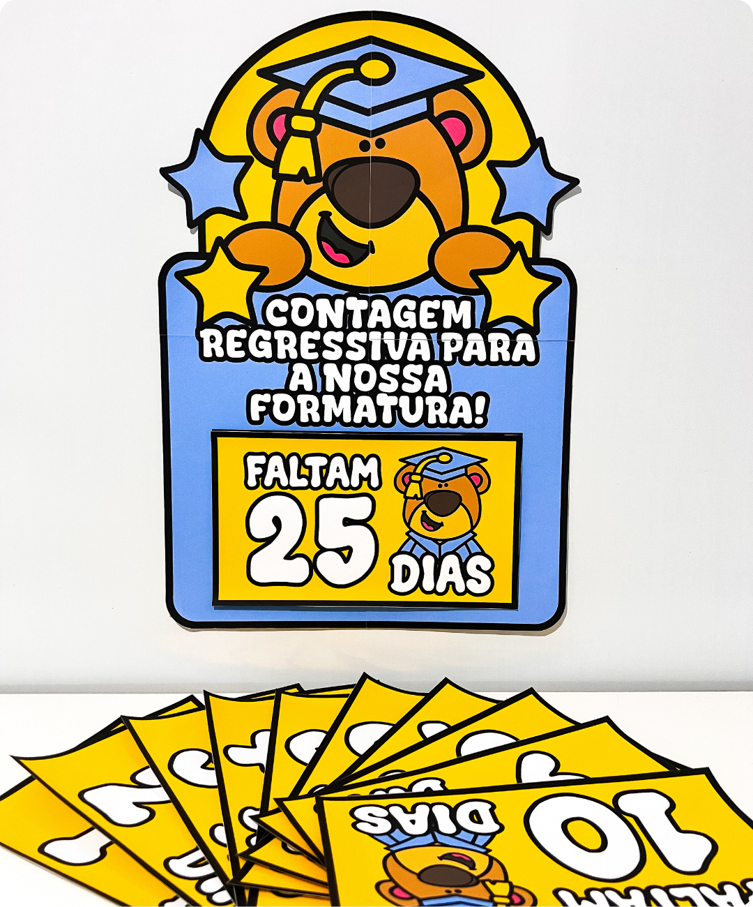 O material lúdico Contagem Regressiva Formatura é um recurso encantador para acompanhar, de forma divertida, os dias que faltam para a grande celebração de formatura! Composto por um painel ilustrado com um simpático ursinho formando e fichas numeradas de 60 a 1 dia, o conjunto permite montar uma contagem regressiva visual e envolvente.