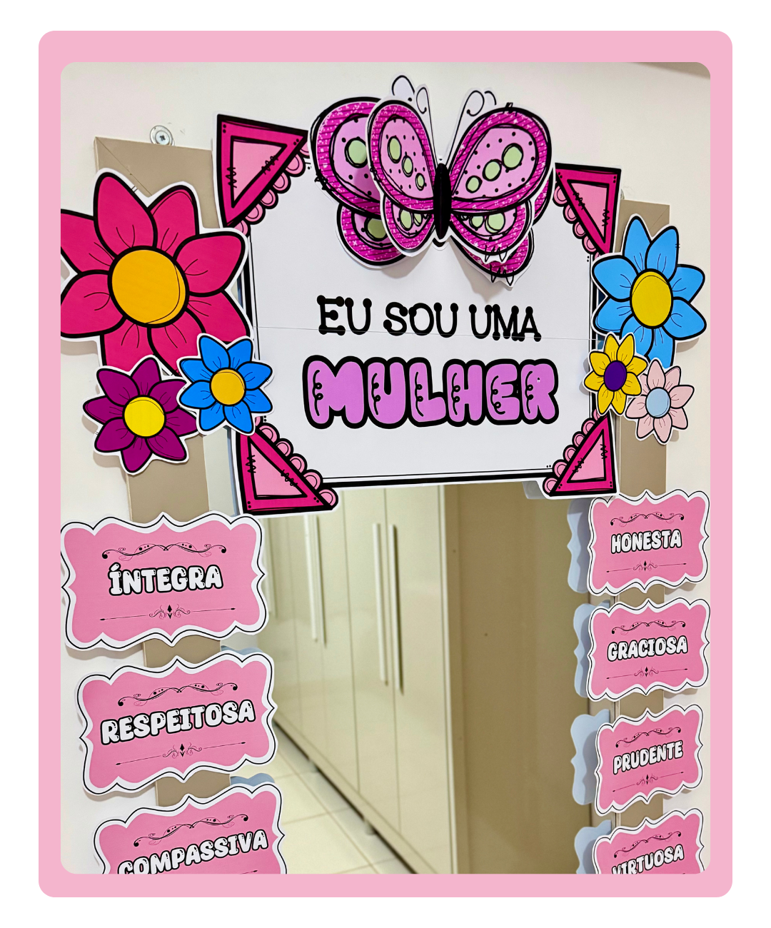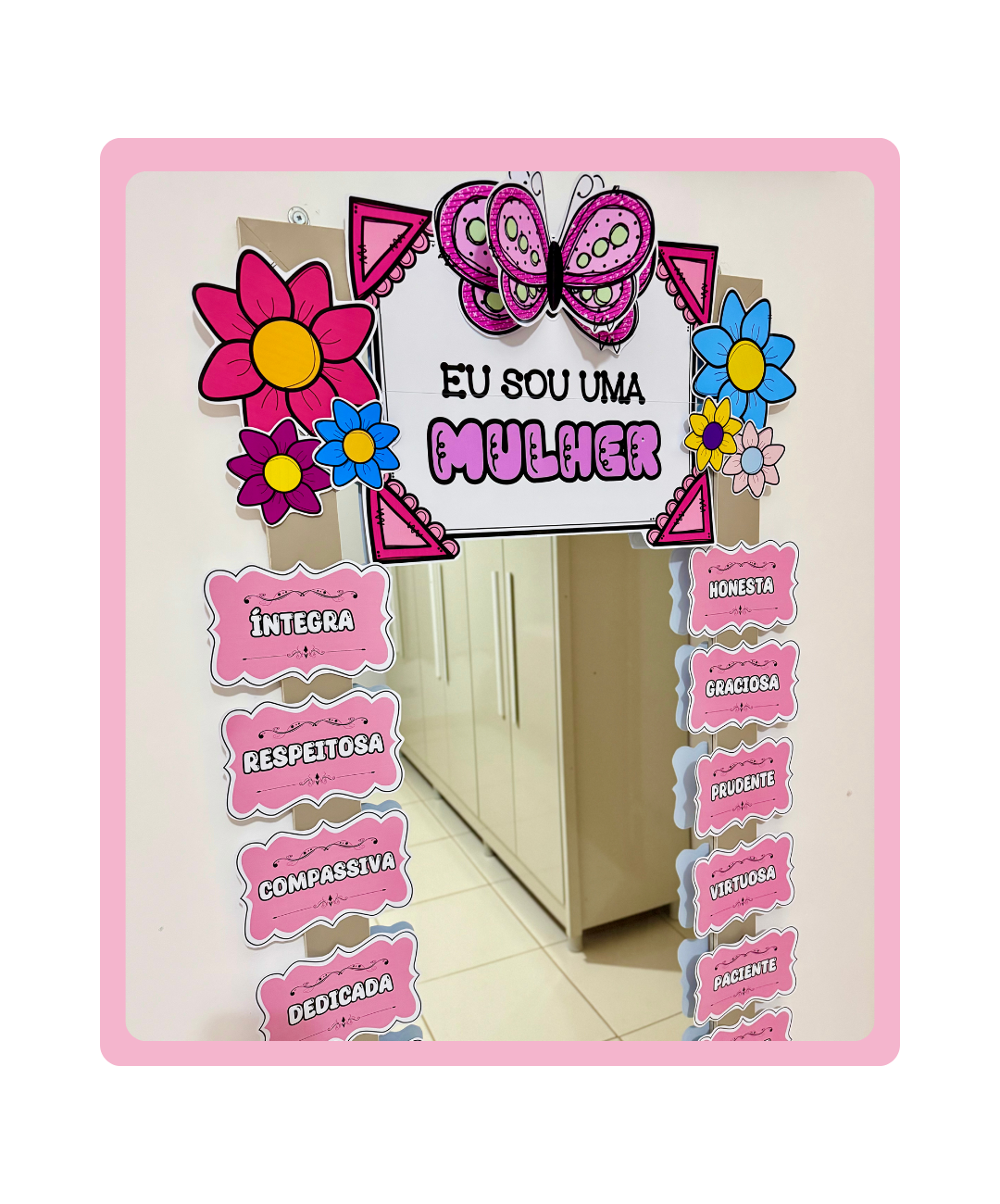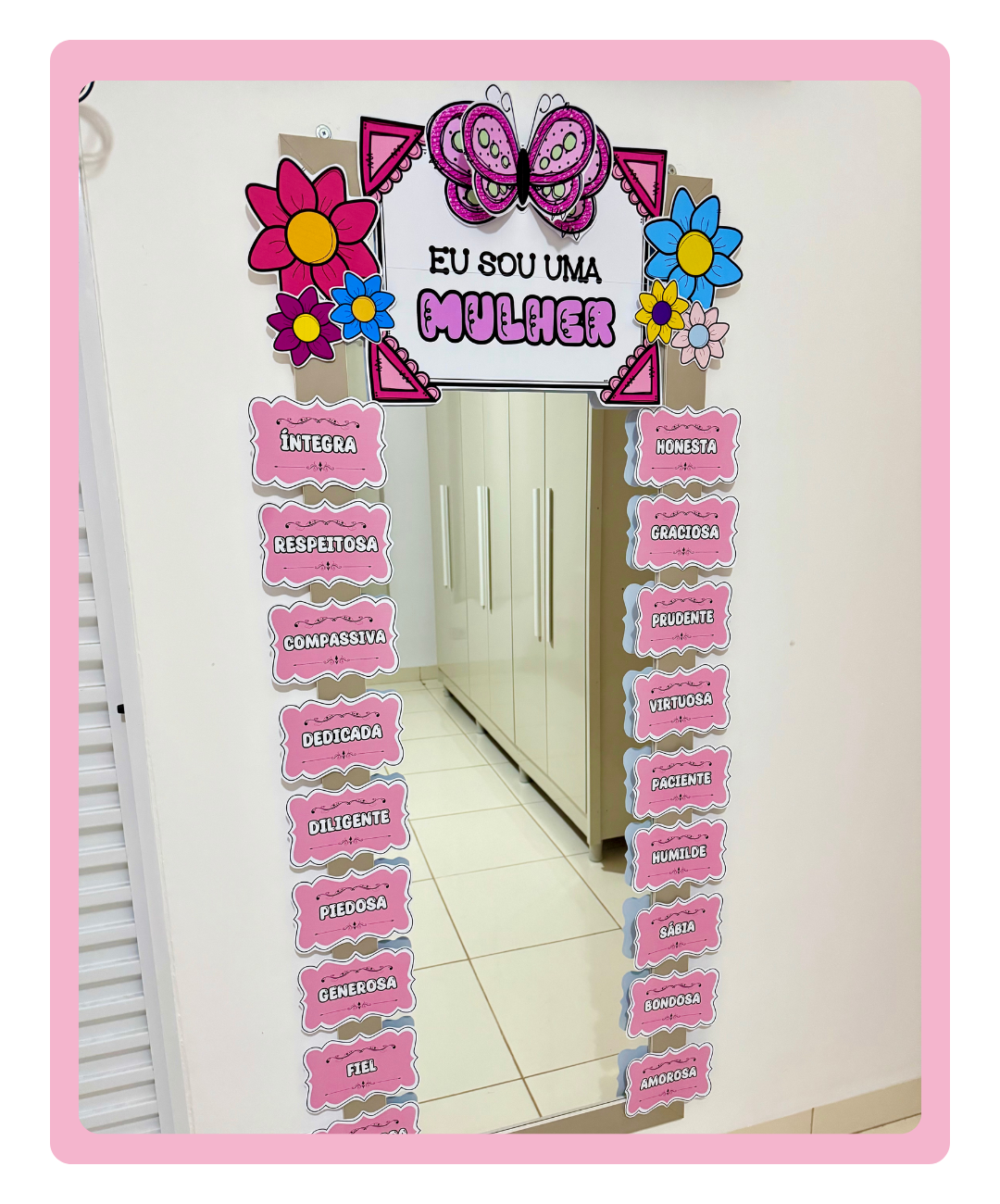 Com palavras-chave motivacionais e uma decoração encantadora, este espelho das afirmações é ideal para alunas, professoras e funcionárias.