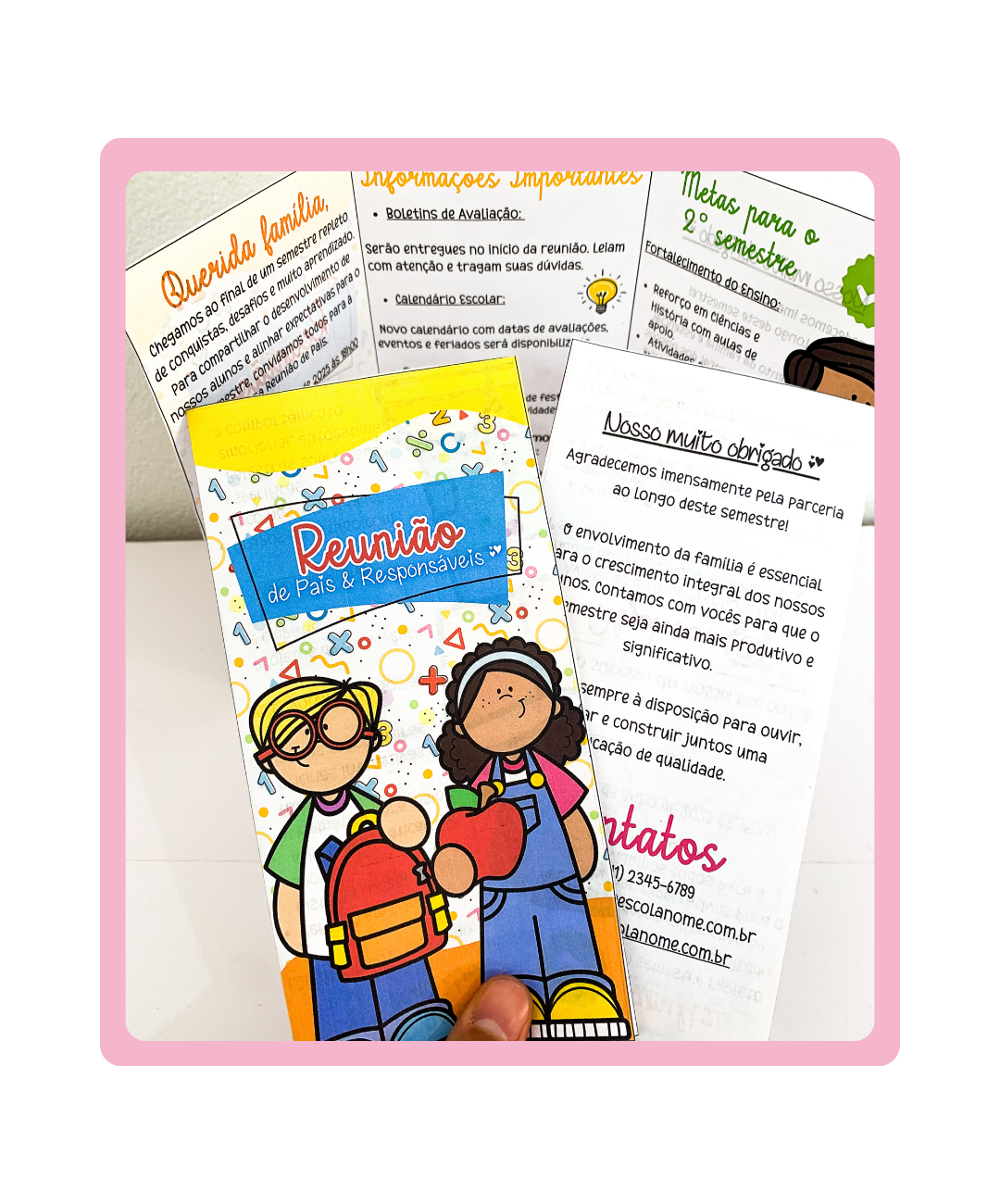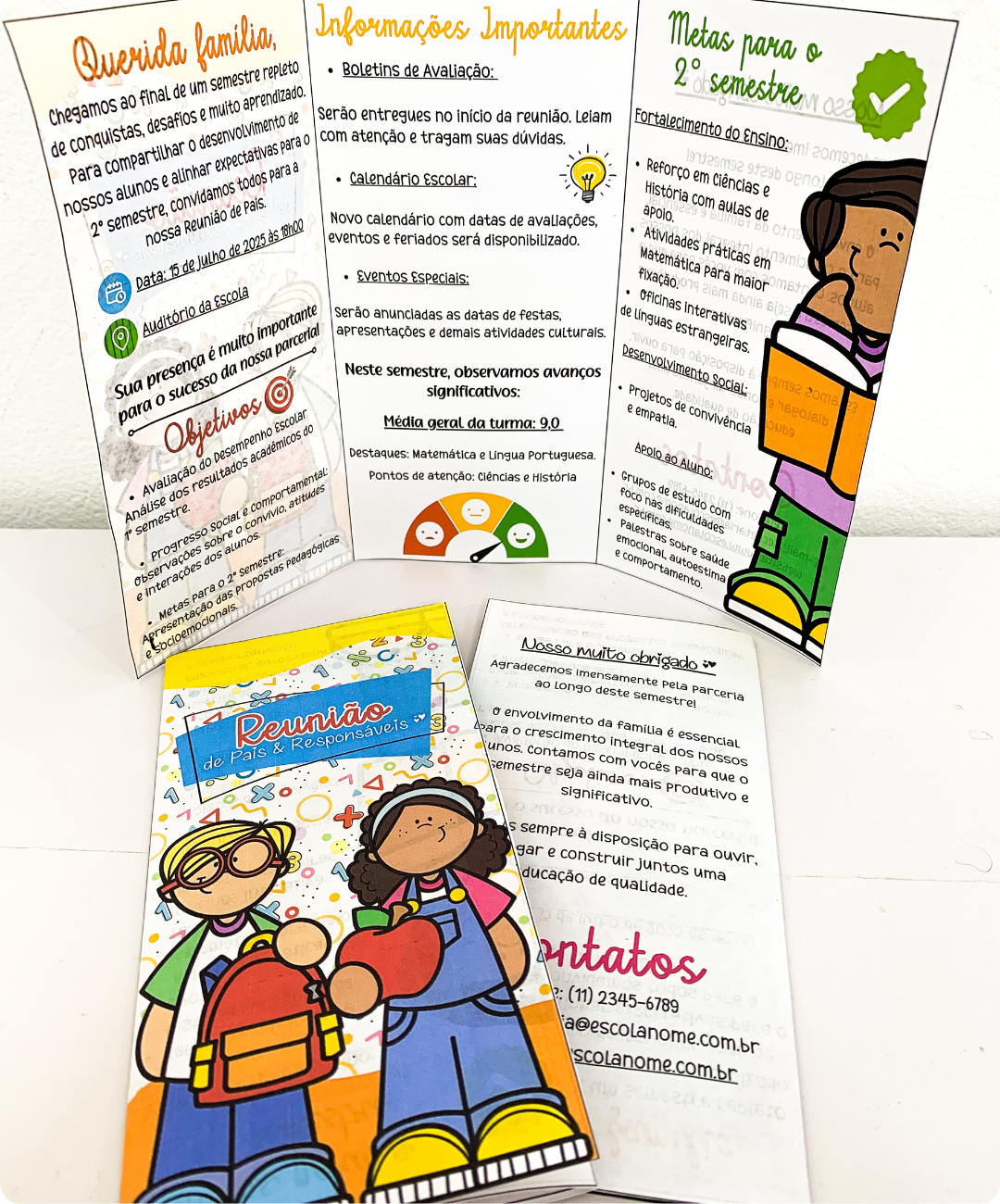 Preparamos um folder completo e editável para te ajudar a organizar esse encontro tão importante com as famílias! É Com ele, você pode apresentar o progresso dos alunos, alinhar metas para o próximo semestre e adaptar com as informações que fizerem mais sentido para a sua turma!