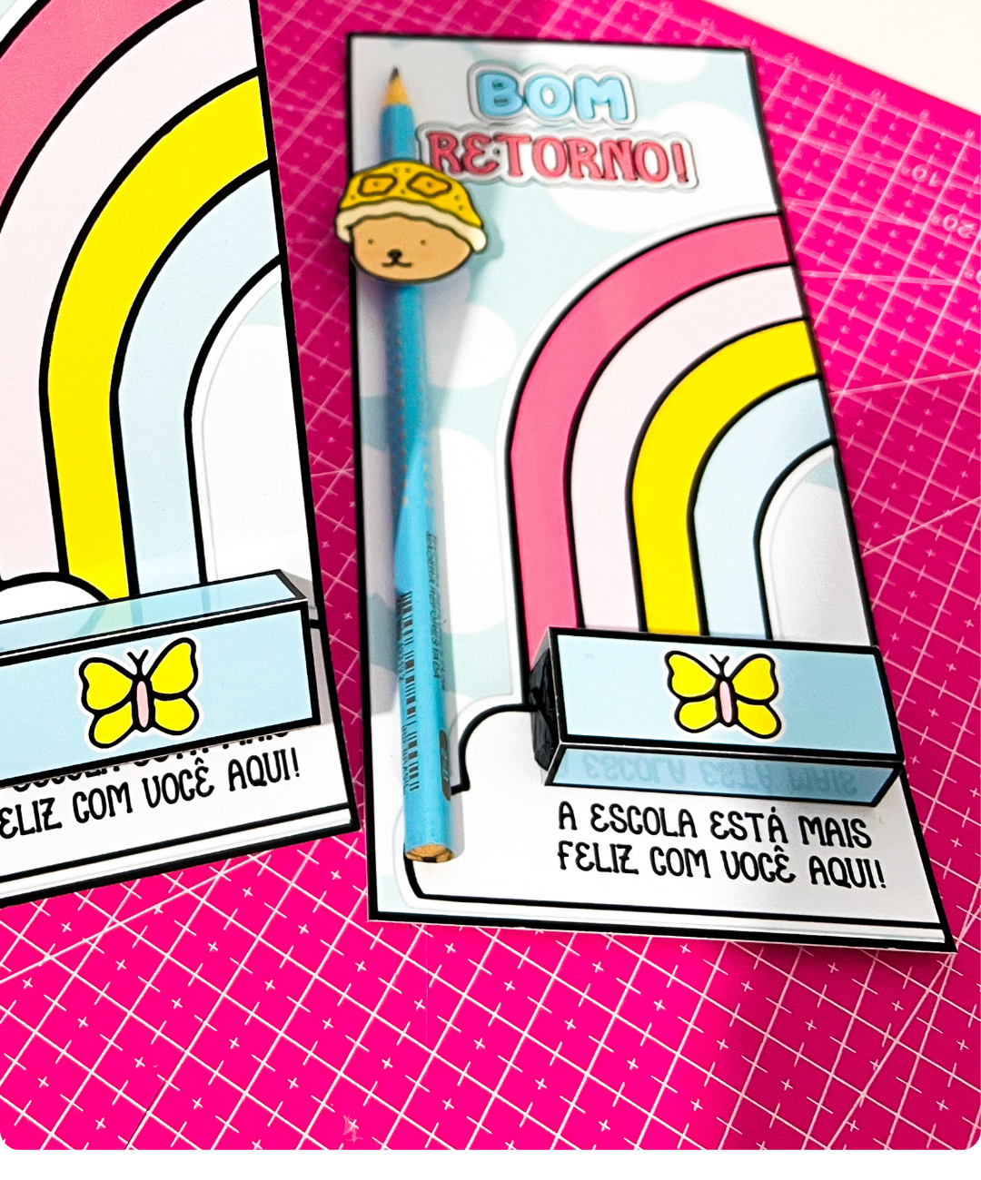 Cartão fofo com tema Bobbie Goods, decorado com arco-íris em tons pastel, personagens do tema e mensagens como “Bom Retorno!” E “A escola está mais feliz com você aqui”.