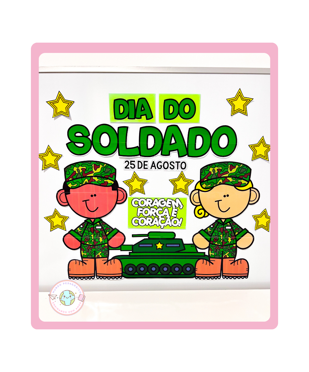 O “Painel Dia do Soldado” é um material educativo e decorativo composto por 15 folhas coloridas, ideal para homenagear o Dia do Soldado (25 de agosto) em salas de aula ou ambientes escolares. O painel traz ilustrações lúdicas de dois personagens infantis vestidos com uniforme camuflado, um tanque de guerra e diversas estrelas decorativas que enriquecem o visual.