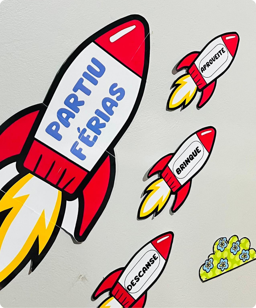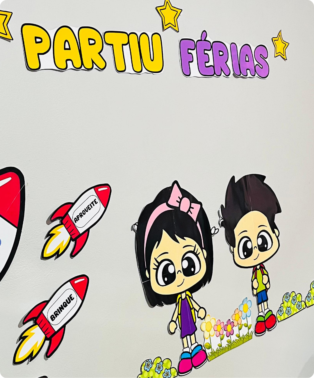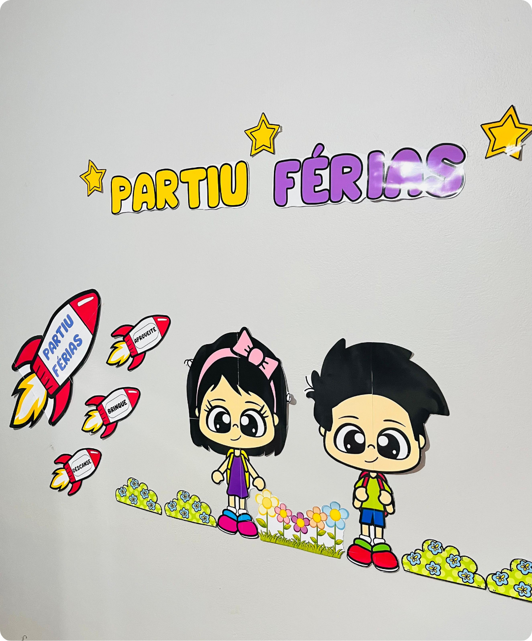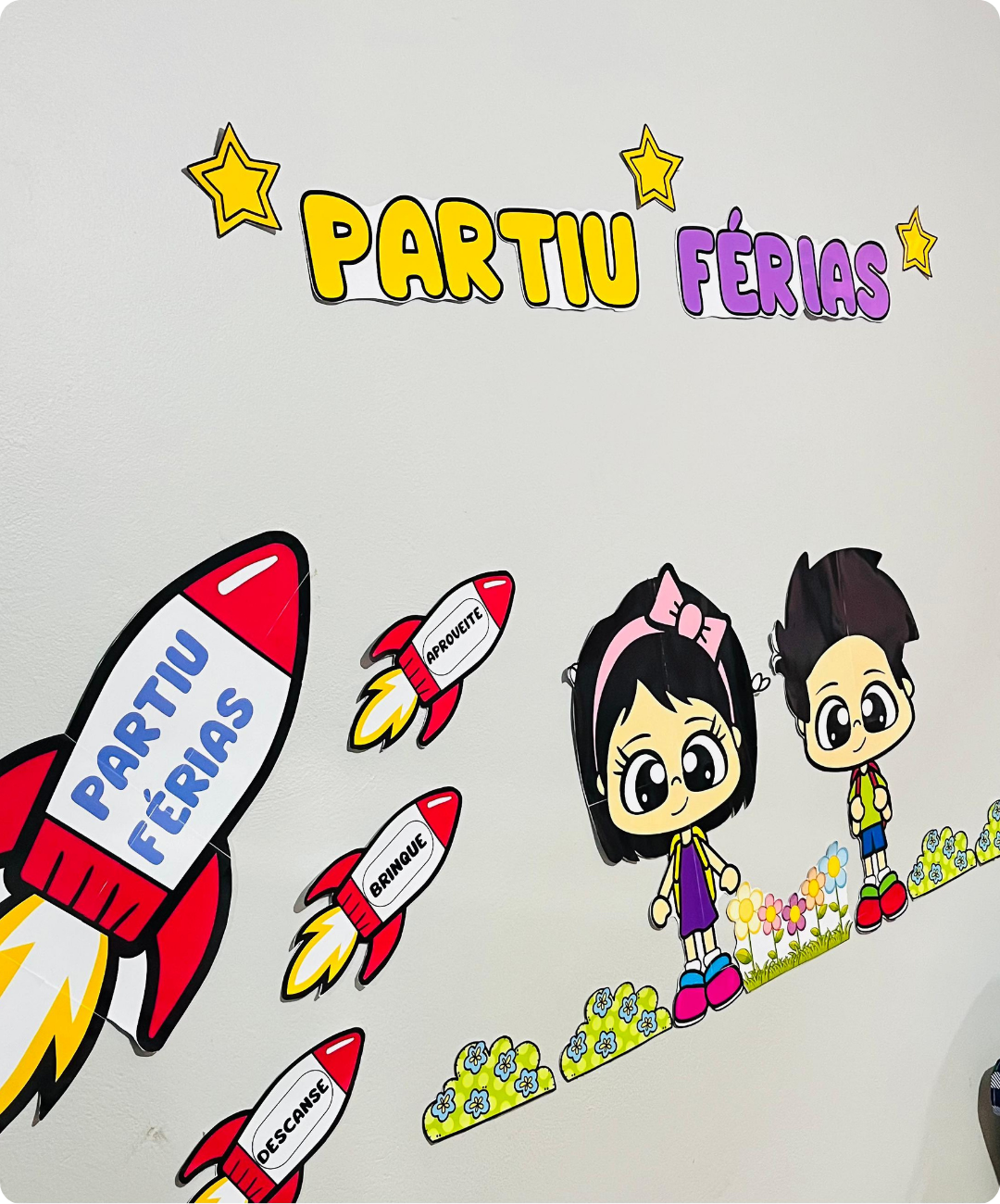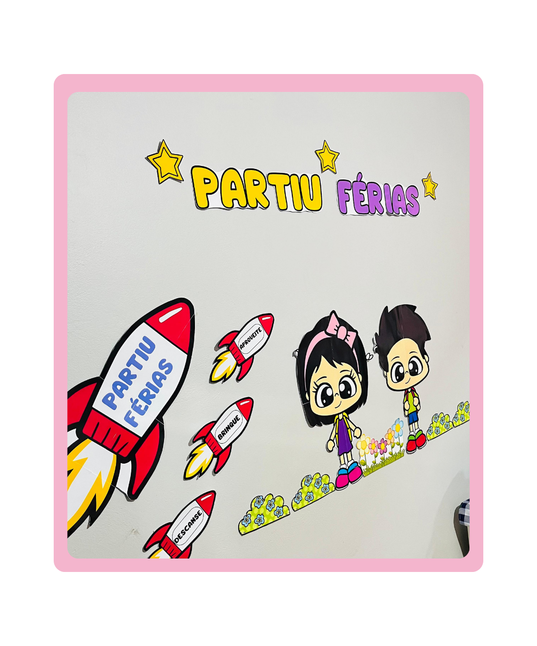O painel partiu férias tem o objetivo de incentivar os alunos a se divertir e descansar nas férias.