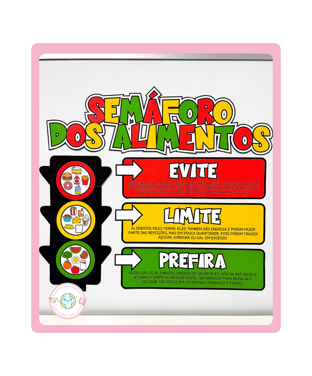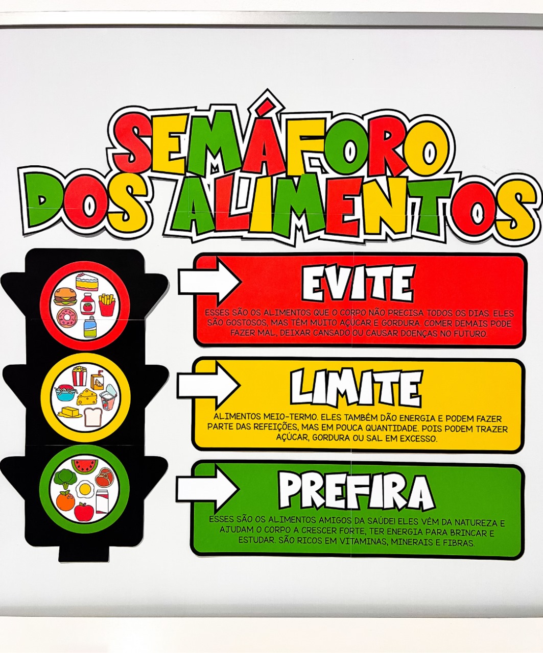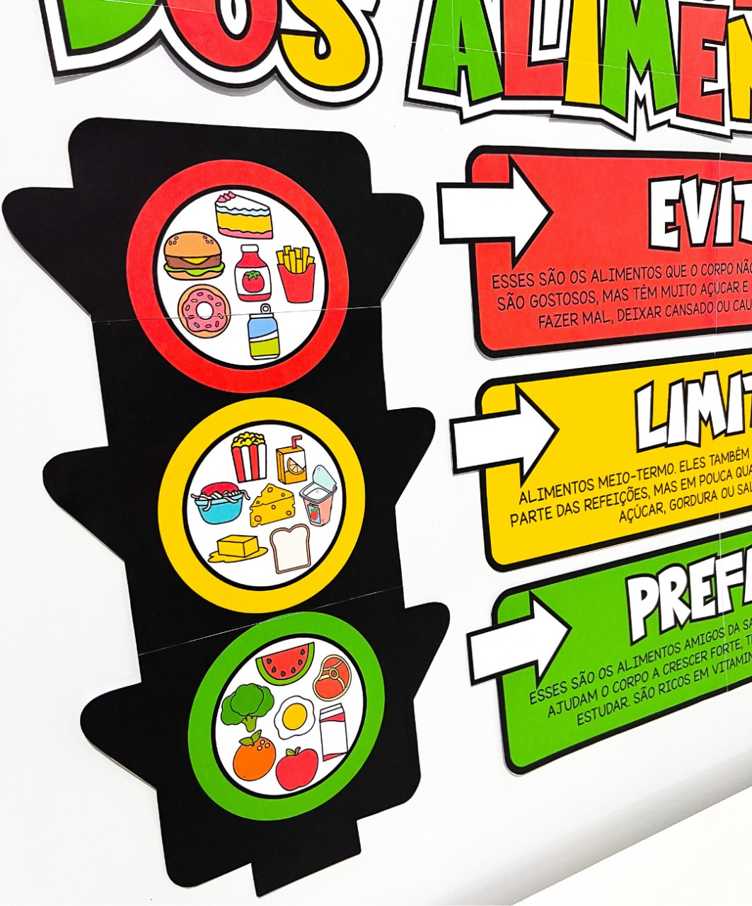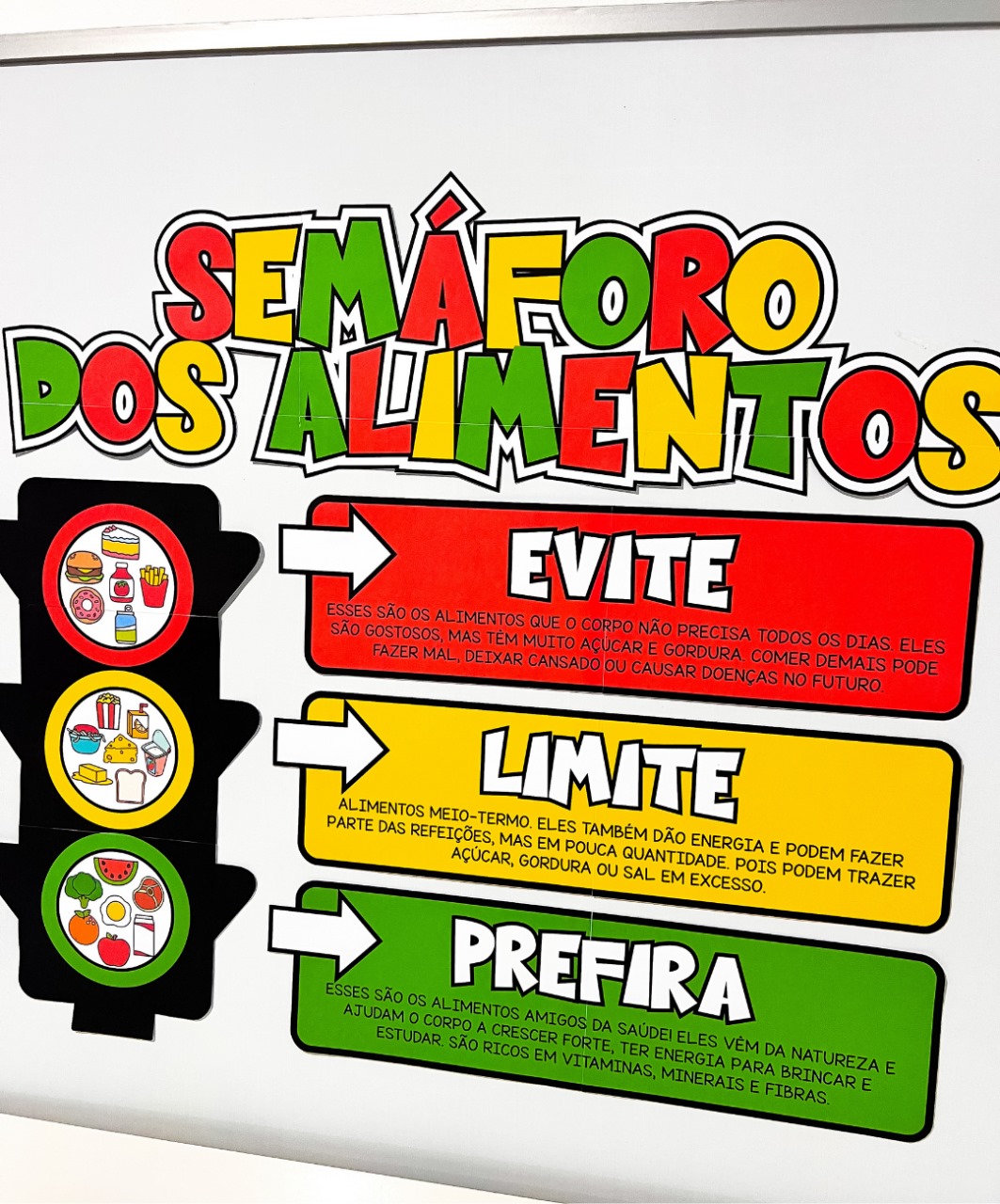 O Painel Semáforo da Alimentação é um recurso educativo visual e colorido, ideal para trabalhar a educação alimentar de forma lúdica com crianças. No arquivo vai dois tamanhos, um maior e um menor e o maior é o da foto. O material utiliza o formato de um semáforo para representar, de maneira